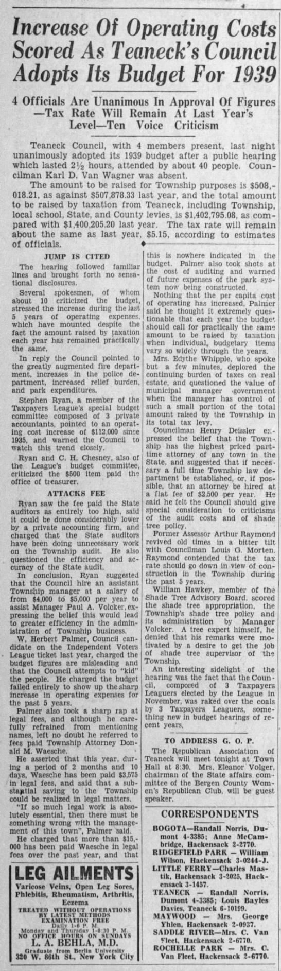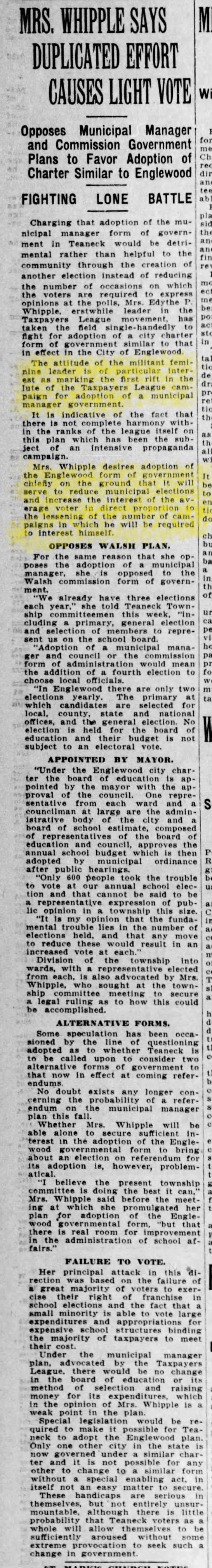 She was part of the Teaneck Tax-Payers League, which brought into existence our current form of government. She also fell out of sync with her fellow league