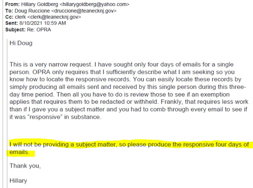 ** The lawsuit filed by Hillary Zaer Goldberg against the Township of Teaneck started with this request: